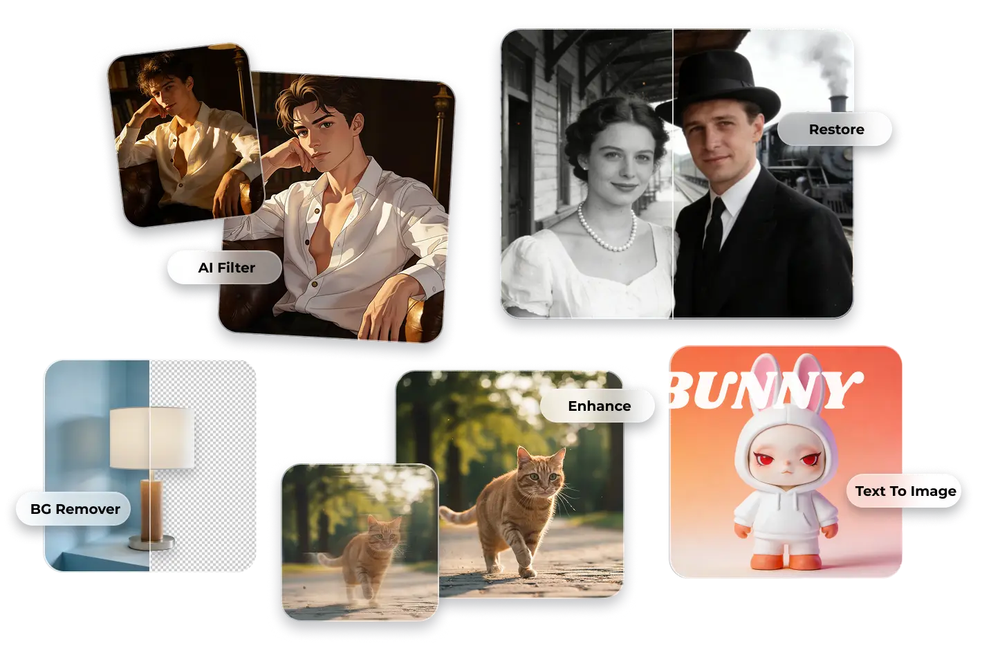 Escolha entre 15+ ferramentas profissionais para melhorar, restaurar ou transformar suas fotos. Nossa IA generativa analisa sua imagem na hora e aplica melhorias precisas — com um resultado natural.