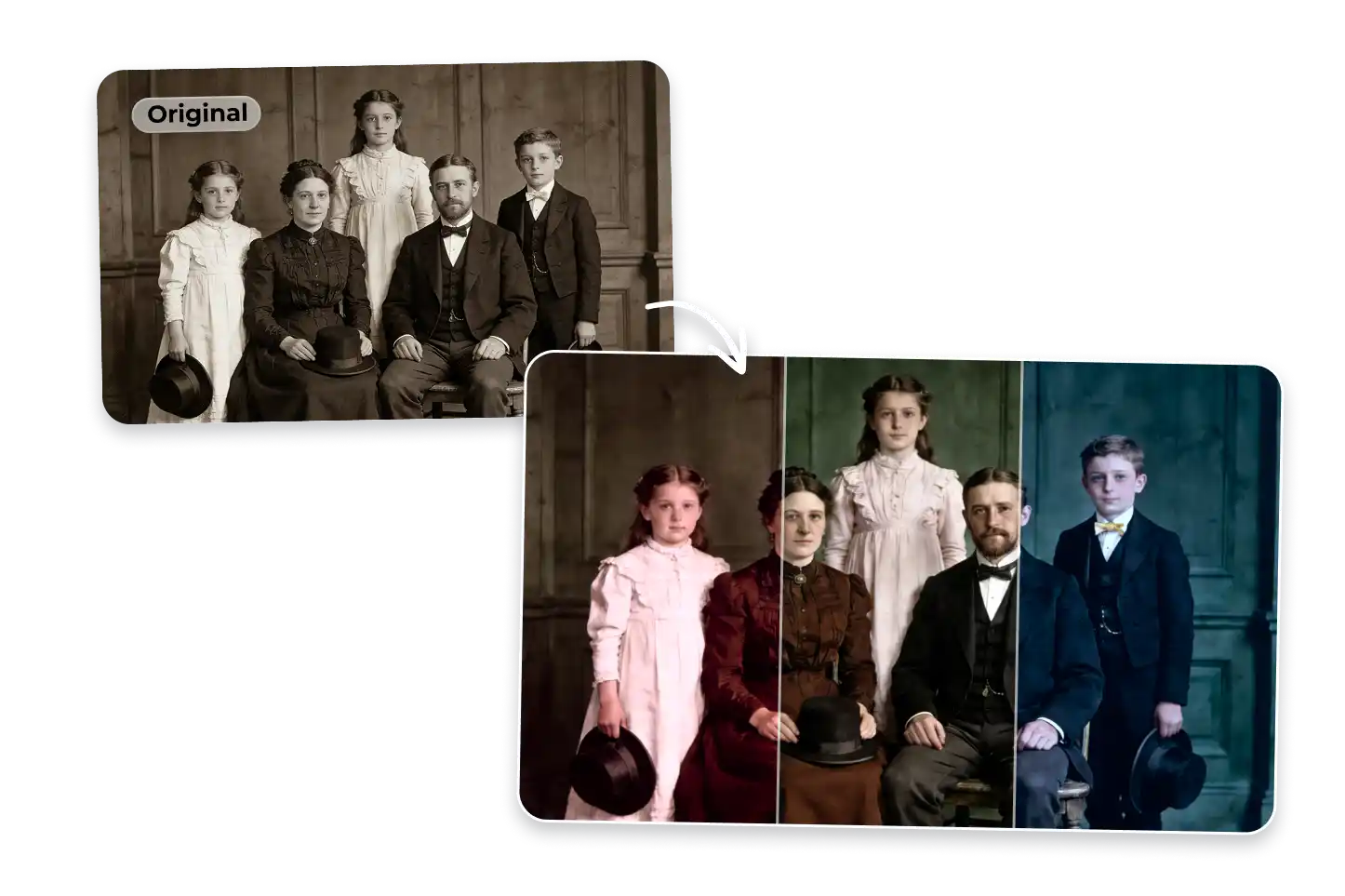 Tem fotos de família preciosas que estão desbotadas, danificadas ou presas no passado? As ferramentas de restauração de fotos do PhotoGrid revivem essas memórias com só alguns cliques. Nosso editor de fotos com IA online grátis repara arranhões, rasgos e manchas que o tempo deixou. Aproveite o realce de cores apagadas para recuperar a vibração do momento original. Seja para preservar a história da família, criar presentes com significado ou digitalizar álbuns antigos, o PhotoGrid vai de pequenos retoques a uma restauração completa — transformando fotos frágeis em lembranças digitais cristalinas.